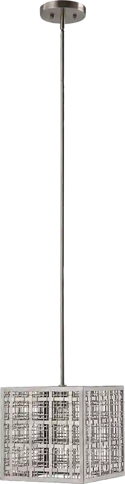 Plaid patterned woven satin nickel strips give us an updated traditional feel for the classic square Aiden Grove pendant. Add this pendant above your dining room or in your living room for a touch of contemporary styling. Supplied with 15' wire, 3-12 stems and 1-6 stems for adjustable installation. Professional installation by an electrician is recommended.