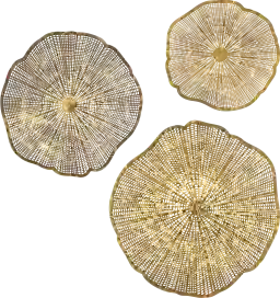 In the Aiydin wall decor set, radiant flowers of laser cut metal are finished in gold with natural distressing to create depth and richness to any space. Use multiple for a more dramatic display, hanging from any direction.