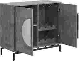 Complement any space in your home with this sleek, modern, and distinctive Akochia bar cabinet. Its artfully crafted design immediately draws the eye. Features include a beautiful wine rack that holds 7 bottles of wine of all varieties and sizes. This cabinet offers plenty of space for delicate vases or glassware. Use the open shelves to showcase your beverage, ceramic collections, or hang and display your wine glasses. Customer assembly is required.