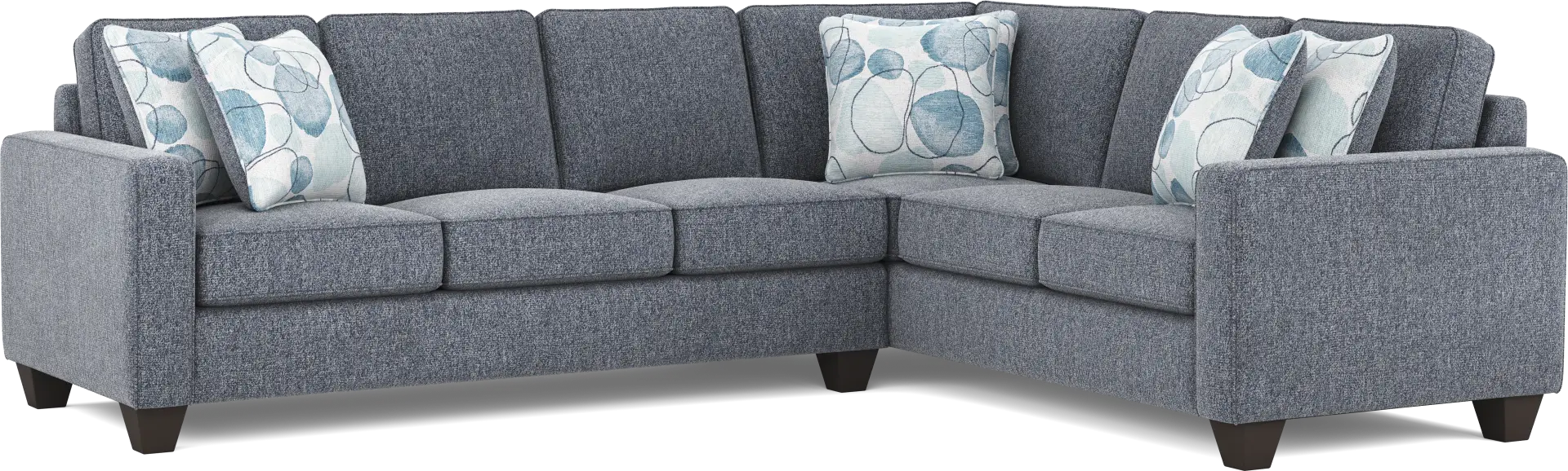 Providing a relaxed atmosphere and open, inviting ambiance, the Alanis Bay sleeper sectional exudes everyday comfort with a sophisticated undertone. Upholstered in woven blue fabric, this transitional seat features welted details and sleek track arms for a smart, stylish look. Loose seat cushions allow for easy maintenance and adjustment. Nestled away for overnight company, the Nature's Bed gel foam mattress with outstanding body contouring support provides a cool and comfortable place for rest. Tapered block legs and a padded outside frame complete the visually appealing ensemble of detailing. Upholstery: 100% Polyester.