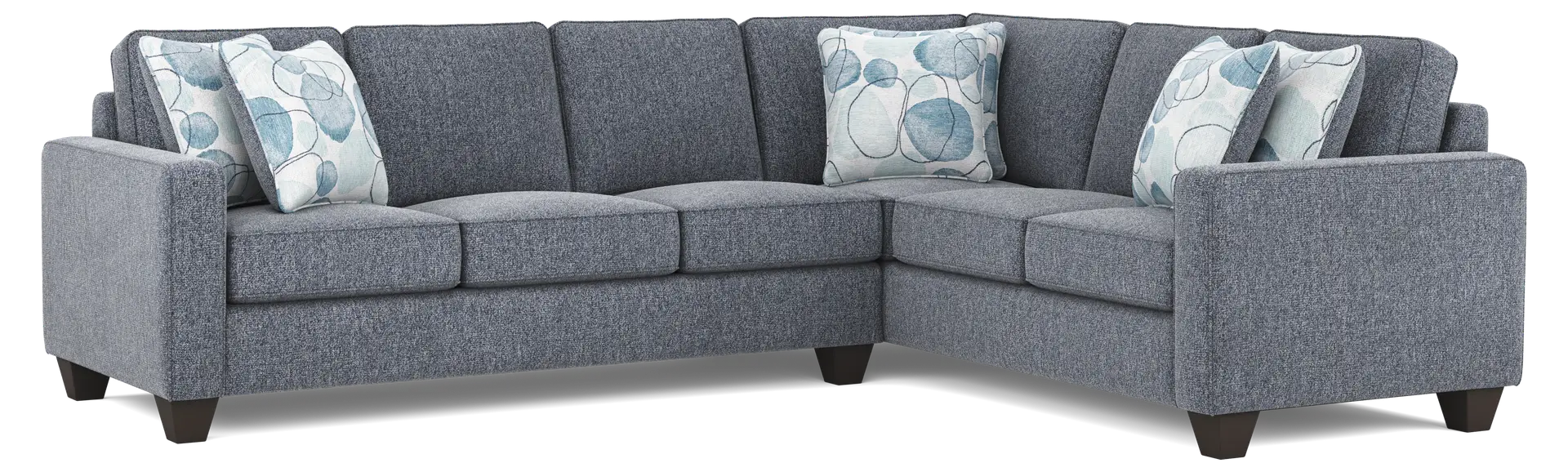 Providing a relaxed atmosphere and open, inviting ambiance, the Alanis Bay sectional exudes everyday comfort with a sophisticated undertone. Upholstered in gray woven fabric, this transitional two-piece sectional features plush seating, complete with welted details and stylish track arms for a smart, stylish look. Loose seat cushions allow for easy maintenance and adjustment. Tapered block legs and a padded outside frame complete the visually appealing ensemble of detailing. Upholstery: 100% Polyester.