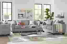This sofa measures 82 inches wide, 35 inches deep, and 37 inches high. Its contemporary design, characterized by sleek track arms and tapered block legs, helps it maintain a visually lighter profile. These dimensions make the Alanis Bay Gray Sofa a versatile choice that can integrate effectively into both more expansive living rooms and provide comfortable seating in smaller apartments or compact living areas.