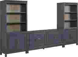 In the calm flow of a tranquil gathering space, the Albion collection pairs timeless style with modern sophistication. Transitional in style, this wall unit comes in a navy-blue finish and features a rectangular 72-inch console with four decorative panel drawers that provide generous storage. Flanking the console, two bookcase piers offer more organized storage with a bottom cabinet, while the three top shelves bring bold contrasting display space with warm brown acacia veneers lining the back. Elongated brass pulls add a touch of warmth and contrast, while straight legs finish the look with refinement.