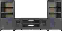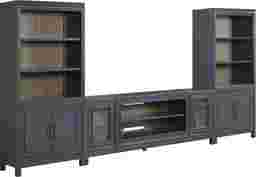 This 3-piece set offers a versatile balance of display and concealed storage. The two flanking bookcase piers each feature three open top shelves for decor and a bottom cabinet for hidden storage. The central console adds further utility with open center shelving and side cabinets featuring ribbed glass inlays for subtle texture.