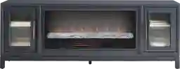 In the calm flow of a tranquil gathering space, the Albion console pairs timeless style with modern sophistication. Transitional in style, this piece comes in a navy-blue finish and features a bold contrasting interior with warm brown acacia veneers lining the back. At the center, an energy-saving LED firebox provides remote-controlled heat and ambient lighting with four color-changing options, creating a warm and cozy atmosphere at the touch of a button. Flanking cabinet doors showcase ribbed glass inlays for subtle texture and intrigue, while elongated brass pulls complete the look with a touch of warmth and contrast.