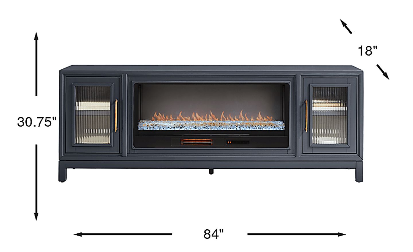 In the calm flow of a tranquil gathering space, the Albion console pairs timeless style with modern sophistication. Transitional in style, this piece comes in a navy-blue finish and features a bold contrasting interior with warm brown acacia veneers lining the back. At the center, an energy-saving LED firebox provides remote-controlled heat and ambient lighting with four color-changing options, creating a warm and cozy atmosphere at the touch of a button. Flanking cabinet doors showcase ribbed glass inlays for subtle texture and intrigue, while elongated brass pulls complete the look with a touch of warmth and contrast.