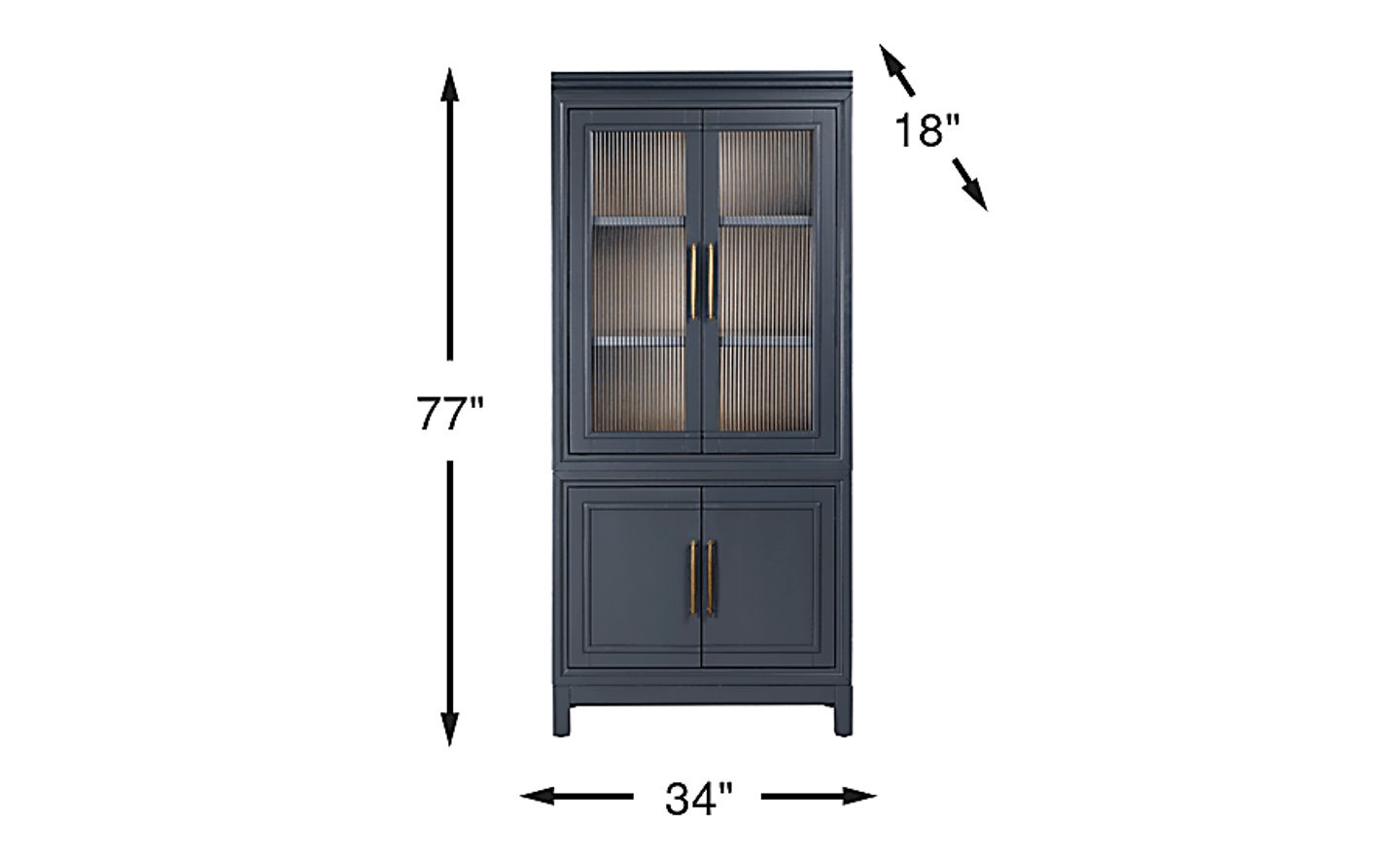 In the calm flow of a tranquil gathering space, the Albion pier pairs timeless style with modern sophistication. Transitional in style, this piece comes in a navy blue finish and features a bold contrasting interior with warm brown acacia veneers lining the back. Behind two ribbed glass inlayed doors are three shelves that offer subtle display space. Two bottom cabinet doors with panel fronts reveal two shelves for hidden storage. Elongated brass pulls complete the look with a touch of warmth and contrast.