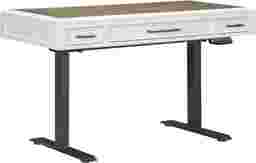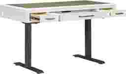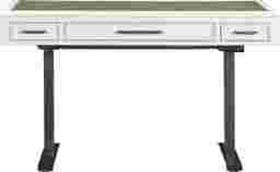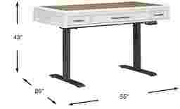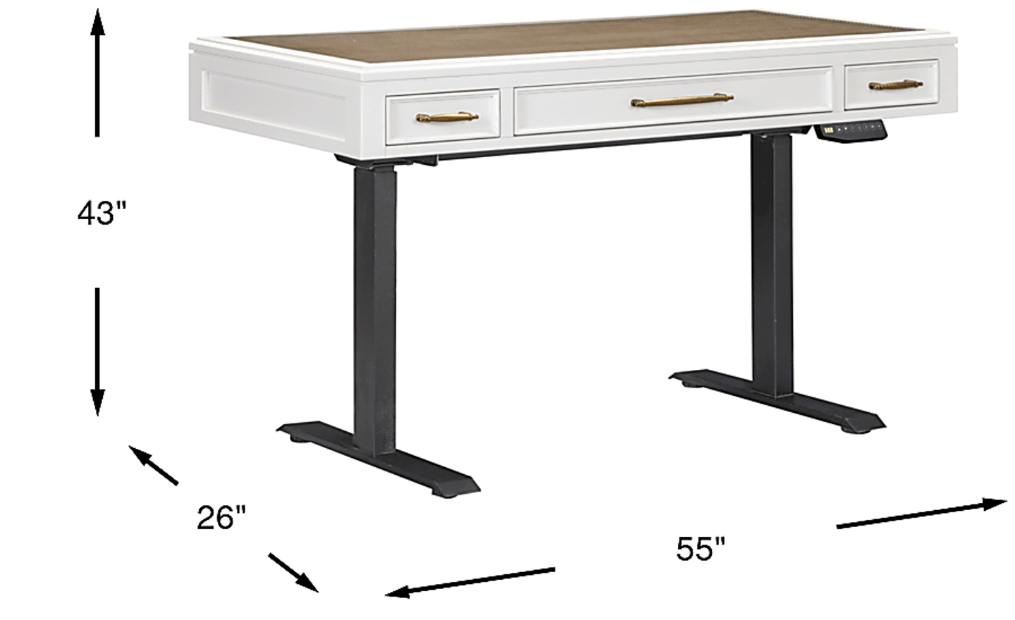 In the quiet rhythm of a productive morning, the Albion adjustable desk takes shape with intention as it pairs timeless style with modern versatility. This transitional piece features a warm brown acacia veneer top set within a white frame, creating a sleek, refined contrast. The base's metal legs lift and lower to your preferred height, letting you move seamlessly from deep focus to easy flow. Three tailored drawers keep essentials close at hand, while the center drawer front folds down to form an extended workspace or pull-out keyboard tray. Brass pulls add a final note of understated sophistication.