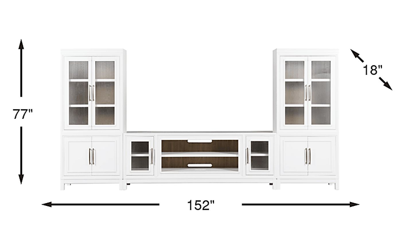 This three-piece wall unit is designed for significant presence and functionality, measuring a total of 152 inches (nearly 13 feet) in width. The central console is 84 inches wide, making it an ideal foundation for large-format televisions up to 85 inches. To ensure a perfect fit in your home, we recommend measuring your wall space to account for the full 152-inch span and allowing for a few inches of clearance on either side to maintain a balanced, airy look in the room.