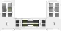 In the calm flow of a tranquil gathering space, the Albion collection pairs timeless style with modern sophistication. Transitional in style, this wall unit comes in a white finish and a bold contrasting interior with warm brown acacia veneers lining the back. At the center, a rectangular 84-inch console offers a clean, clutter free set up with open center shelves with wire management holes and cabinet doors that showcase ribbed glass inlays for subtle texture and intrigue. Flanking the console, two bookcase piers provide hidden storage with bottom cabinets, while the top cabinets echo the glass detailing for continuity. Elongated brass pulls add a touch of warmth and contrast, while straight legs finish the look with refinement.