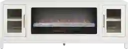 In the calm flow of a tranquil gathering space, the Albion console pairs timeless style with modern sophistication. Transitional in style, this piece comes in a white finish and features a bold contrasting interior with warm brown acacia veneers lining the back. At the center, an energy-saving LED firebox provides remote-controlled heat and ambient lighting with four color-changing options, creating a warm and cozy atmosphere at the touch of a button. Flanking cabinet doors showcase ribbed glass inlays for subtle texture and intrigue, while elongated brass pulls complete the look with a touch of warmth and contrast.