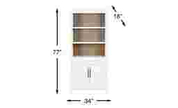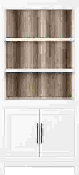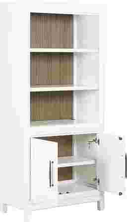 In the calm flow of a tranquil gathering space, the Albion bookcase pairs timeless style with modern sophistication. Transitional in style, this piece comes in a white finish and features a bold contrasting interior with warm brown acacia veneers lining the back. Three open top shelves provide ample display space, while bottom cabinet doors with panel fronts offer hidden storage. Elongated brass pulls complete the look with a touch of warmth and contrast.