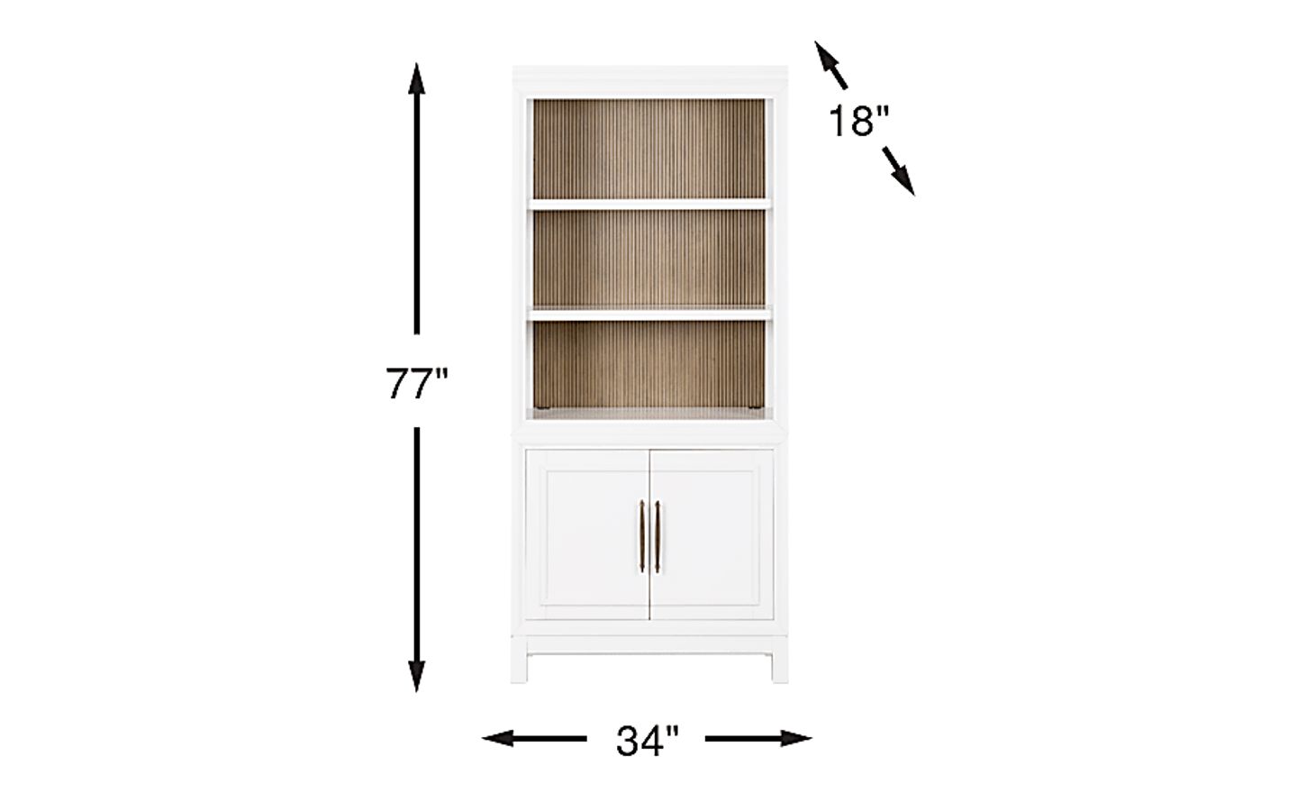 In the calm flow of a tranquil gathering space, the Albion bookcase pairs timeless style with modern sophistication. Transitional in style, this piece comes in a white finish and features a bold contrasting interior with warm brown acacia veneers lining the back. Three open top shelves provide ample display space, while bottom cabinet doors with panel fronts offer hidden storage. Elongated brass pulls complete the look with a touch of warmth and contrast.