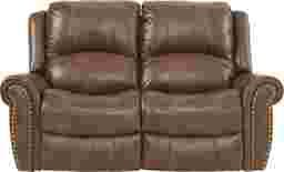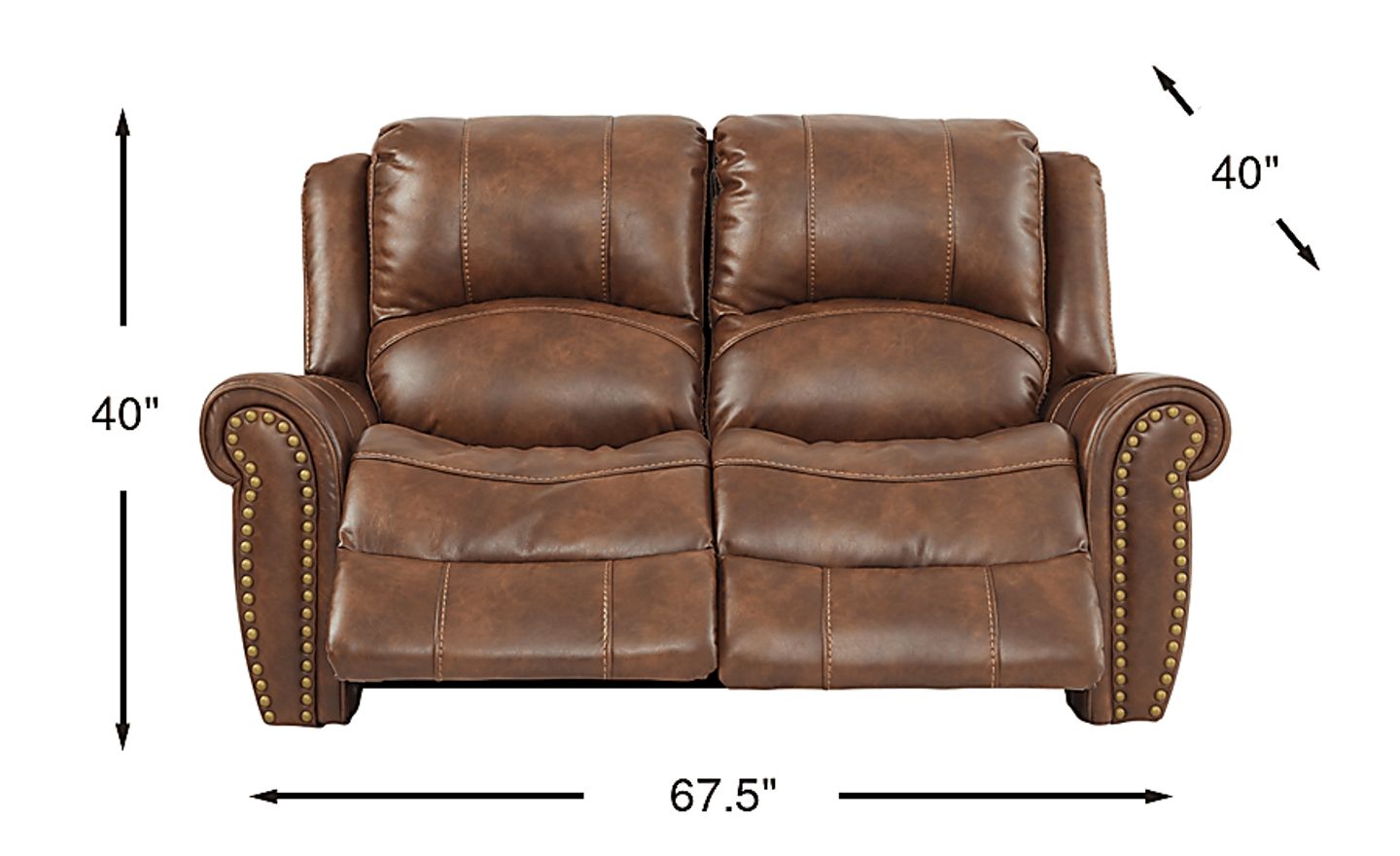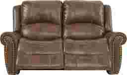 The Alden Point power reclining loveseat is great for any living room or den. Offering cozy seating for two, it's everything you love about your favorite cozy recliner, but with extra room to share! Upholstered in luxurious whiskey brown fabric, this plush seat boasts dual power reclining chaise style foot rests for full leg support at the touch of a button. Padded roll arms and bucket style seating offer added comfort, while antique brass finished nail head accents and contrasting stitching contribute a traditional stylish touch. 100% polyester