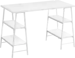Yes. While this desk features a minimalist design without drawers, it maximizes vertical storage through its industrial-style sawhorse legs. These legs support four integrated open shelves, offering a convenient place to organize reference books, storage bins, or decorative accents right at your feet, helping to keep your main workspace clutter-free.