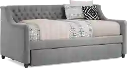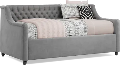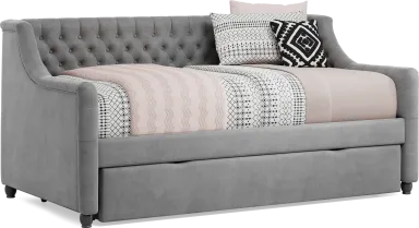 Give the guest room or your child's room the glam treatment! The ultra-chic, super versatile Alena daybed is a wonderful selection, whether you're looking for an extra seat or a bed for an overnight guest. Soft velvet upholstery in a stylish charcoal color is accented with stately tufting along the interior on both the inside back and sides. Gently rounded edges add plenty of panache, giving it a fashionably chic silhouette. The included underbed trundle is perfect for storing seasonal clothes, games, or even an extra mattress. Mattress and bedding not included. Bed shown is full size.