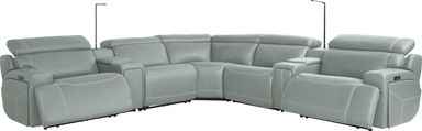 An elegant and nuanced invocation of an evening in meditation overlooking the Manhattan skyline, the Alessio dual power reclining sectional from Cindy Crawford Home has the quiet power of style and substance in its enchanting silhouette. A modern beauty, this sectional boasts mint top grain leather where the body touches on in its single attached back and seat cushion and sophisticated track arms. Featuring a console with push-up button for hidden cupholders and a reading light for late nights reading and studying, its dual power reclining includes zero gravity capabilities for the utmost in relaxing Zen. Additional hidden storage is located on the outside of the arm and USB-A and USB-C charging capabilities add the final touch of modern convenience. Upholstery: Top grain leather where the body touches and polyurethane fabric sides and backs. Leather is a durable, low maintenance product, however, general regular maintenance is necessary. To keep your leather clean, vacuum it regularly, removing any dust, and clean it with water and a mild non-detergent soap.