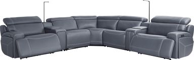 An elegant and nuanced invocation of an evening in meditation overlooking the Manhattan skyline, the Alessio dual power reclining sectional from Cindy Crawford Home has the quiet power of style and substance in its enchanting silhouette. A modern beauty, this sectional boasts blue top grain leather where the body touches on in its single attached back and seat cushion and sophisticated track arms. Featuring a console with push-up button for hidden cupholders and a reading light for late nights reading and studying, its dual power reclining includes zero gravity capabilities for the utmost in relaxing Zen. Additional hidden storage is located on the outside of the arm and USB-A and USB-C charging capabilities add the final touch of modern convenience. Upholstery: Top grain leather where the body touches and polyurethane fabric sides and backs. Leather is a durable, low maintenance product, however, general regular maintenance is necessary. To keep your leather clean, vacuum it regularly, removing any dust, and clean it with water and a mild non-detergent soap.