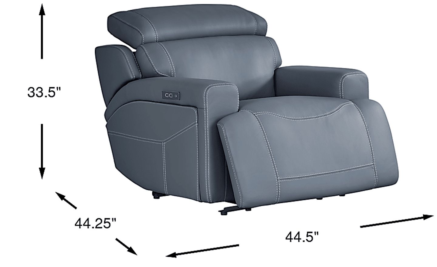 An elegant and nuanced invocation of an evening in meditation overlooking the Manhattan skyline, the Alessio dual power recliner from Cindy Crawford Home has the quiet power of style and substance in its enchanting silhouette. A modern beauty, this piece boasts navy top grain leather where the body touches on in its single attached back and seat cushion and sophisticated track arms. Featuring dual power reclining with a zero gravity mechanism for the utmost in relaxing Zen, USB-A and USB-C charging capabilities add the final touch of modern convenience. Upholstery: Top grain leather where the body touches and polyurethane fabric sides and backs. Leather is a durable, low maintenance product, however, general regular maintenance is necessary. To keep your leather clean, vacuum it regularly, removing any dust, and clean it with water and a mild non-detergent soap.
