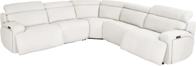 An elegant and nuanced invocation of an evening in meditation overlooking the Manhattan skyline, the Alessio dual power recliner has the quiet power of style and substance in its enchanting silhouette. A modern beauty, this sectional boasts white top grain leather where the body touches on in its single attached back and seat cushion and sophisticated track arms. Featuring dual power reclining including zero gravity capabilities for the utmost in relaxing Zen. Additional hidden storage is located on the outside of the arms and USB-A and USB-C charging capabilities add the final touch of modern convenience. Upholstery: Top grain leather where the body touches and polyurethane fabric sides and backs.