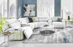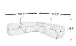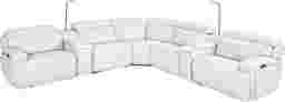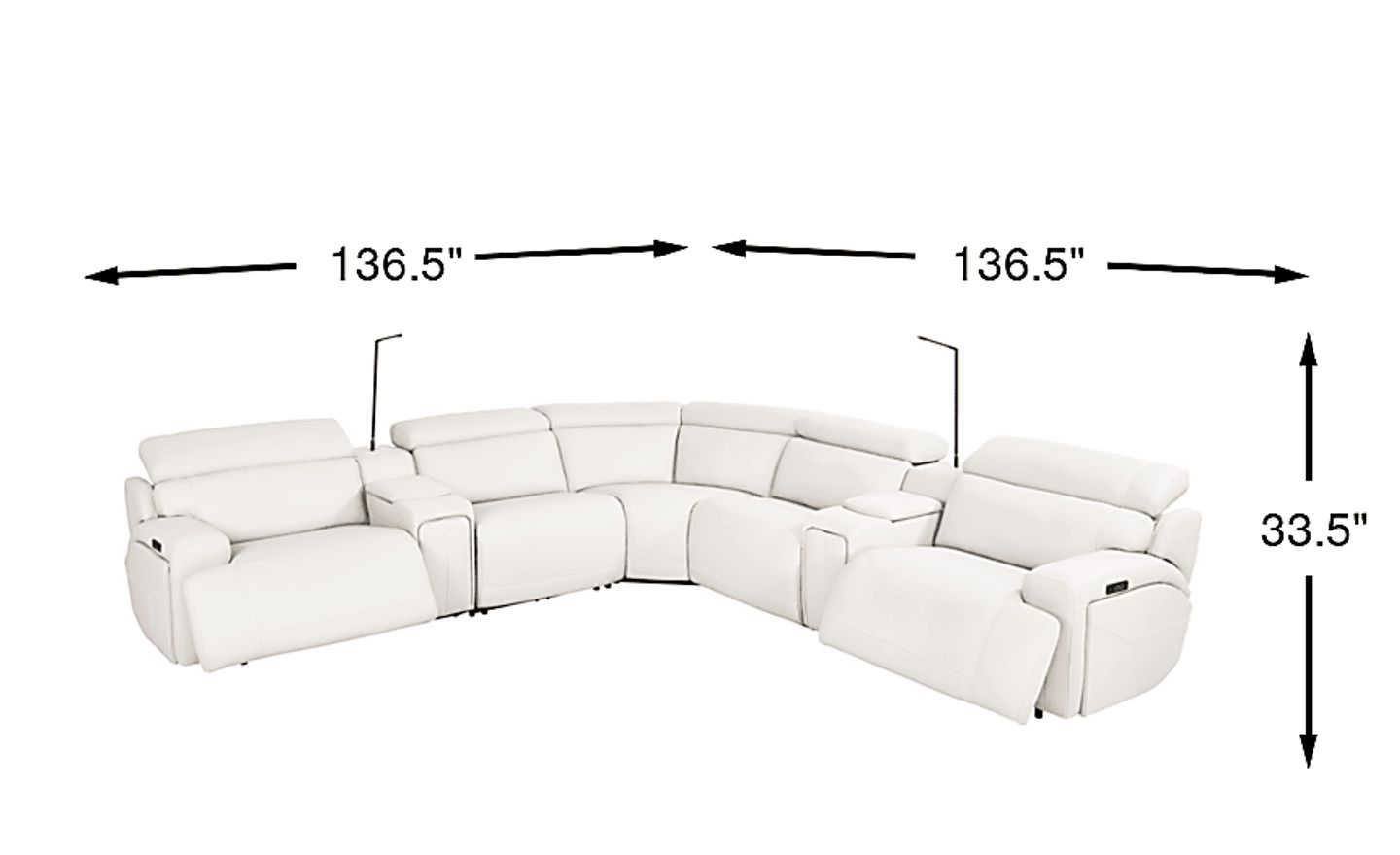 An elegant and nuanced invocation of an evening in meditation overlooking the Manhattan skyline, the Alessio dual power reclining sectional from Cindy Crawford Home has the quiet power of style and substance in its enchanting silhouette. A modern beauty, this sectional boasts white top grain leather where the body touches on in its single attached back and seat cushion and sophisticated track arms. Featuring a console with push-up button for hidden cupholders and a reading light for late nights reading and studying, its dual power reclining includes zero gravity capabilities for the utmost in relaxing Zen. Additional hidden storage is located on the outside of the arm and USB-A and USB-C charging capabilities add the final touch of modern convenience. Upholstery: Top grain leather where the body touches and polyurethane fabric sides and backs.