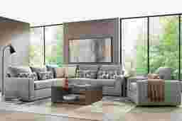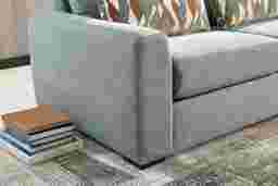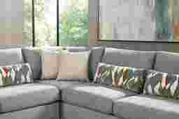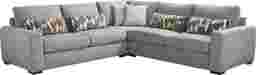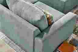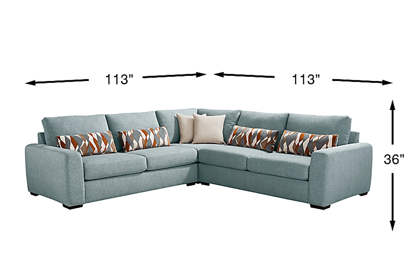 A deep exhale, the noise fades, and calm settles in with the Alexander collection's graceful structure and soothing tones, bringing ease and beauty to the heart of your home. Contemporary in style, this sectional is upholstered in lake blue chenille for a clean versatile look. Subtle curves and sleek track arms add a refined charm, while pillowy deep seating offers cloud-like relaxation. Coordinating kidney and accent pillows showcase geometric motifs in complementing shades of brown and blue, making a bold yet balanced statement. LAF loveseat, corner wedge, RAF loveseat. Upholstery: 100% polyester. Cleaning Instructions: Use water-based cleaning agents or foam.