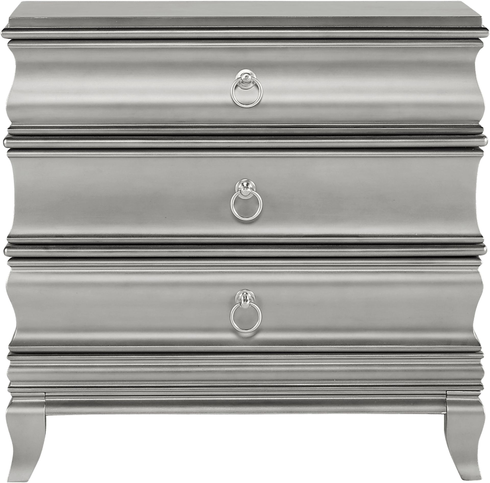 Triple storage drawers and an innovative nightlight feature make the Alexi nightstand an impressive bedside companion. Each drawer, including the felt lined top drawer, is well constructed using English dovetail joints. With the simple touch of a button the bottom of the nightstand lights up to provide a soft, steady glow. Made of poplar solids with rich cherry veneers and a chic silver finish, the nightstand has flowing lines and curved legs.