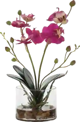 Symbolic of grace and elegance this Alie fuchsia orchid adds an elegant touch to any tabletop. The plant is placed in a clear glass container with faux water and natural river stones. Customer assembly is required.