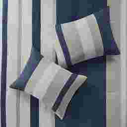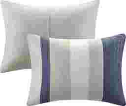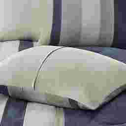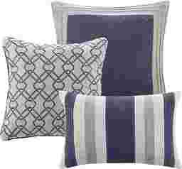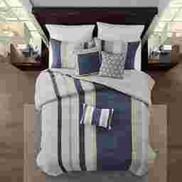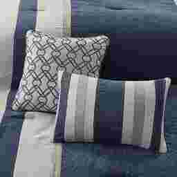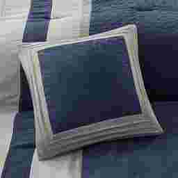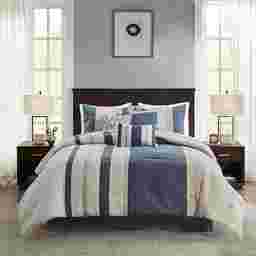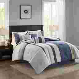 The Alima 7 piece comforter offers an elegant transitional update to your bedroom decor. The microsuede comforter features a vertical pieced color block design with an embossed basket weave and contrast stitching, in blue hues, for an elegant allure. Matching shams mirror the design of the comforter, while a solid bed skirt complements the top of the bed. Three decorative pillows add the finishing touches to this faux suede comforter set. Hypoallergenic polyester filling in the comforter and decorative pillows provides exceptional warmth and comfort. Machine washable for easy care, this 7 piece faux suede comforter set brings one-of-a-kind comfort and style to your bedroom. This set includes 1 comforter, 1 bed skirt, 2 shams and 3 decorative pillows.