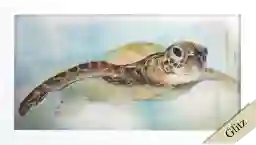 The Alixandr turtle image features a hand applied glass coat epoxy finish. The print is framed in a block profile moulding with a matte white finish. Customer assembly is required.