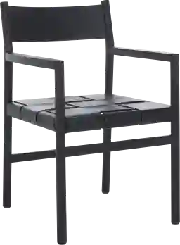 This Allercam black arm chair brings modern luxury to your dining space with its sleek black finish and beautifully woven top grain leather. Crafted from solid Sungkay wood for lasting durability, its unique texture and elegant silhouette offer both comfort and style. Customer assembly required.