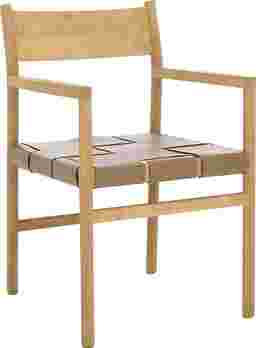 This Allercam natural arm chair brings modern luxury to your dining space with its sleek brown finish and beautifully woven top grain leather. Crafted from solid Sungkay wood for lasting durability, its unique texture and elegant silhouette offer both comfort and style. Customer assembly required.