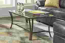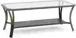 Easily able to blend with a variety of decors the Allie cocktail table features an eye catching combination of elements. It boasts a 48 x 24 inch rectangular tempered glass top with clipped corners and a 1 inch bevel. The metal base features a pewter finish and lower display shelves comprised of decorative ceramic tiles. Customer assembly required.