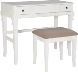 Simplify your personal routine and design aesthetic with one classic set. The Alline vanity and seat, both with gracefully curved legs and decorative trim, complement any bedroom or dressing area. The design boasts practical features like a top that opens to reveal a mirror and storage space and a flip down front panel and cord management makes using small appliances, like hair dryers and flat irons, easy. Two drawers with square, bronze pulls offer additional space to house small items. A plush matching seat with durable beige upholstery completes the set. Customer assembly is required.