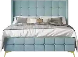 This bed achieves a luxe contemporary aesthetic through the contrast of textures and finishes. The brushed gold-tone metal bracket legs provide a modern, high-fashion accent against the deep blue velvet. Additionally, the button-tufted detailing on both the headboard and footboard adds a sophisticated, architectural element that anchors the bedroom as a stylish focal point.