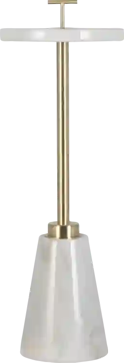The Almiranta white accent table is a contemporary white marble drink table with a brushed bronze and gold metal finish. Customer assembly is required.