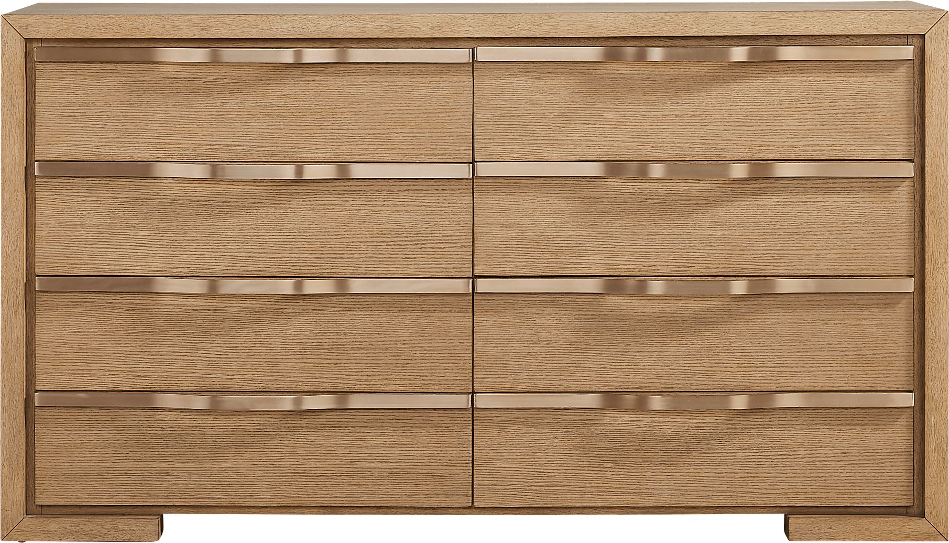 This piece is crafted using quartered oak veneers over a solid square frame. Quarter-sawing is a premium technique that results in a more stable grain structure, significantly reducing the wood's natural tendency to expand and contract. This ensures that the dresser maintains its crisp, modern silhouette and structural integrity over time, while the luxurious gold finger pulls offer a resilient hardware solution that resists wear.