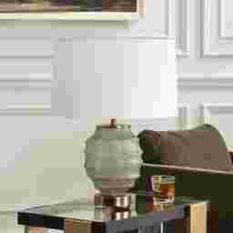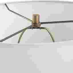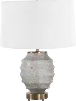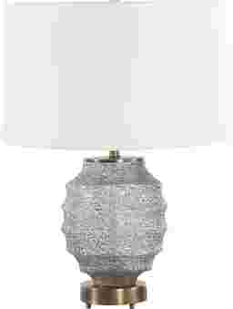The Alpine Place Clear Lamp offers a unique and stylish lighting option crafted from textured glass. Its ribbed glass base in tones of dark bronze, rust brown and frosted white offers a rustic yet modern appeal and is accented with antiqued brass plated details. The slightly tapered round hardback shade is covered in a white linen fabric. Partial assembly may be required.
