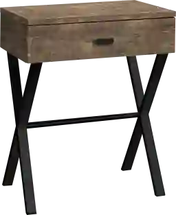 Influenced by the design accomplishments of the past, this mid-century inspired Altondale table has gone through a modern make-over. The iconic lines and styling of this side table paired with a chic brown reclaimed wood-look finish and black metal X base legs, give this table an edgy look that will complete your modern room setting. This versatile table can be used as an accent table in the den, living room or entryway or as a nightstand in the bedroom. Featuring one storage drawer with a chrome handle, this sturdy accent table is perfect to display your favorite objects and keeping things organized in one place. Customer assembly is required.