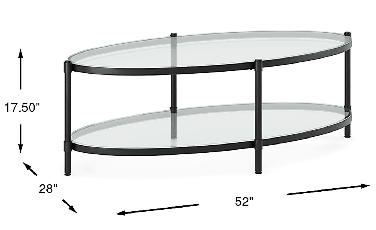 Inviting a touch of refinement with a twinkle in its eye, the Alva cocktail table is a vision of transitional style in sweeping curves and glossy surfaces. The oval frame of this accent features bands of metal in a sleek black finish poise on four straight legs. Glass top and bottom shelves add plenty of storage or display space, while also letting light through from top to bottom.