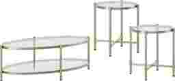 Inviting a touch of refinement with a twinkle in its eye, the Alva table set is a vision of transitional style in sweeping curves and glossy surfaces. The curved frames of these accents feature bands of metal in a sleek gold finish poised on four straight legs each. Glass top and bottom shelves add plenty of storage or display space, while also letting light through from top to bottom. Customer assembly required.