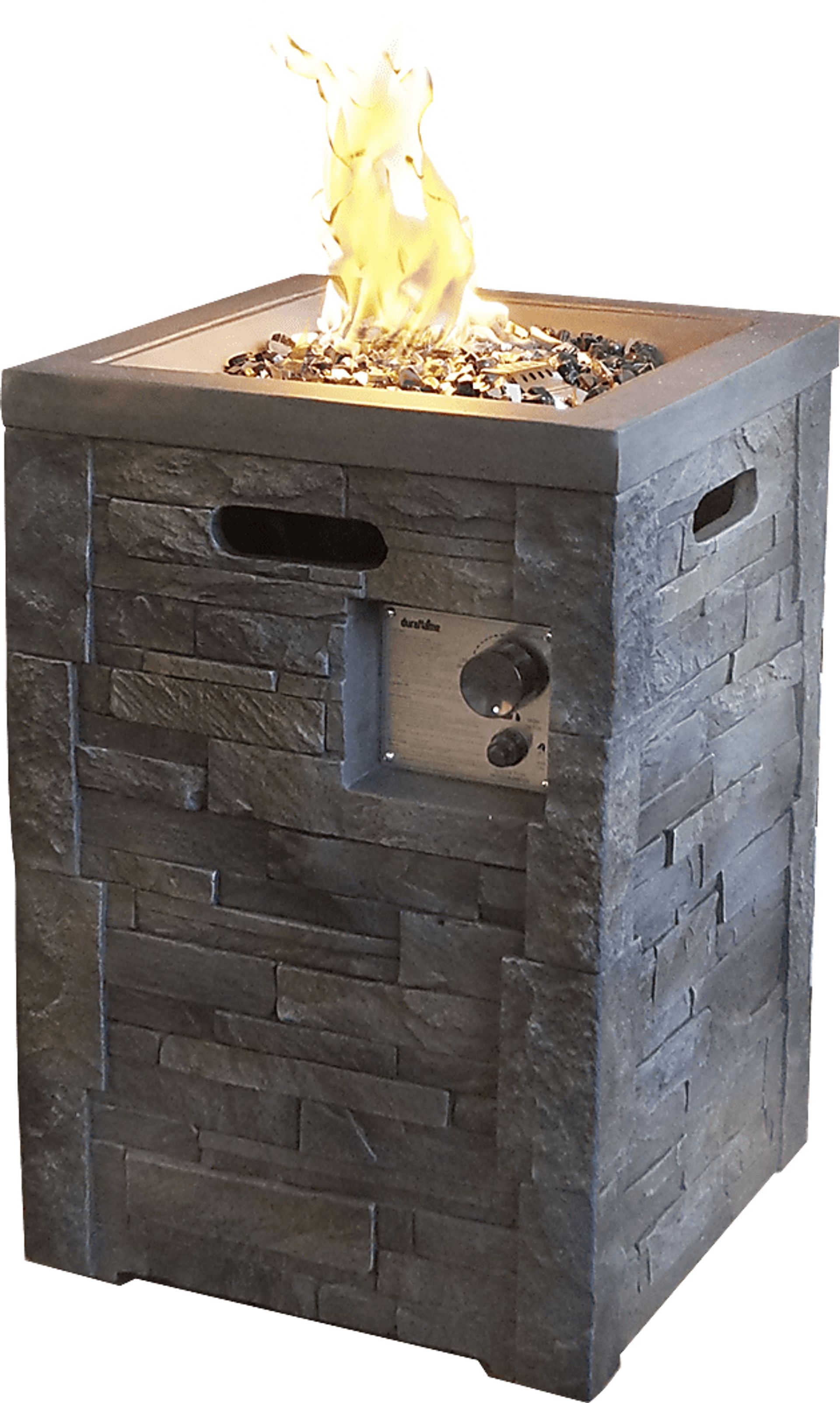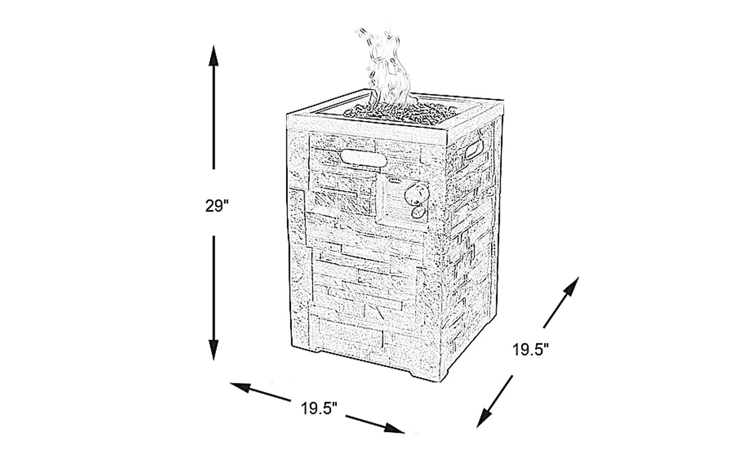 The gray Alvarado fire pit makes a great addition to your outdoor space. Featuring a 19.5-inch square design and stacked stone appearance, this piece has a very permanent feel. This fire pit accommodates a standard propane tank with 32,000 BTU (not included) and is activated with a push-button igniter. An included lid can protect your fire pit when not in use.