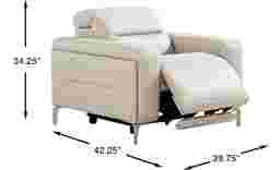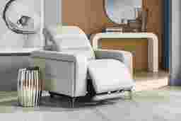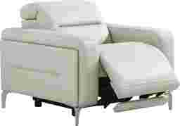 A modern interpretation of serene Italian living, the Drew & Jonathan Amalfi collection is where smooth curves meet tailored details with effortless grace. Contemporary in style, this recliner is upholstered in supple light gray top grain leather where the body touches. Refined stitching lends a clean, polished look, while track arms and silver tapered high legs add an airy, architectural touch. Beneath its sleek design lies true comfort with dual power reclining, offering customized headrest and footrest adjustments through a zero-gravity mechanism that enhances relaxation in every position. A discreet control panel inside the arm features a convenient home button and built-in USB ports. Upholstery: Top grain leather where the body touches and polyurethane fabric sides and backs. Leather is a durable, low maintenance product, however, general regular maintenance is necessary. To keep your leather clean, vacuum it regularly, removing any dust, and clean it with water and a mild non-detergent soap.