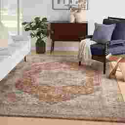 Bring worldly vibes to your space with this vintage Amaru area rug. The classic medallion design, presented in soft shades of blue, grey, gold, and rust, is finished with an artful fade for a time-worn look. Place this Persian rug in your living room, dining room, bedroom, or hallway for an instant touch of sophisticated style. Machine-made from durable polyester yarns that are easy to clean - ideal for busy households, pet parents, and homes with young kids.