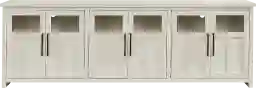 Unwind in a world of understated symmetry, warmth and charm with the Amberfield console's balance of farmhouse elegance and modern functionality. Crafted from poplar wood with rich maple veneers in a beautiful white finish, this farmhouse inspired piece features six doors that reveal adjustable shelves for customizable organization and wire management holes for a clutter-free setup. For a final touch, each door is adorned with black metal pulls and a top glass window to enhance the look.
