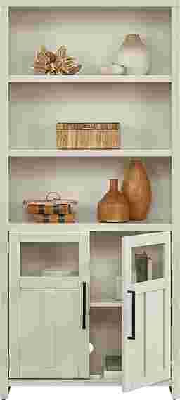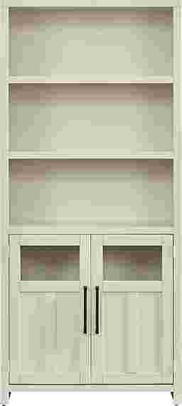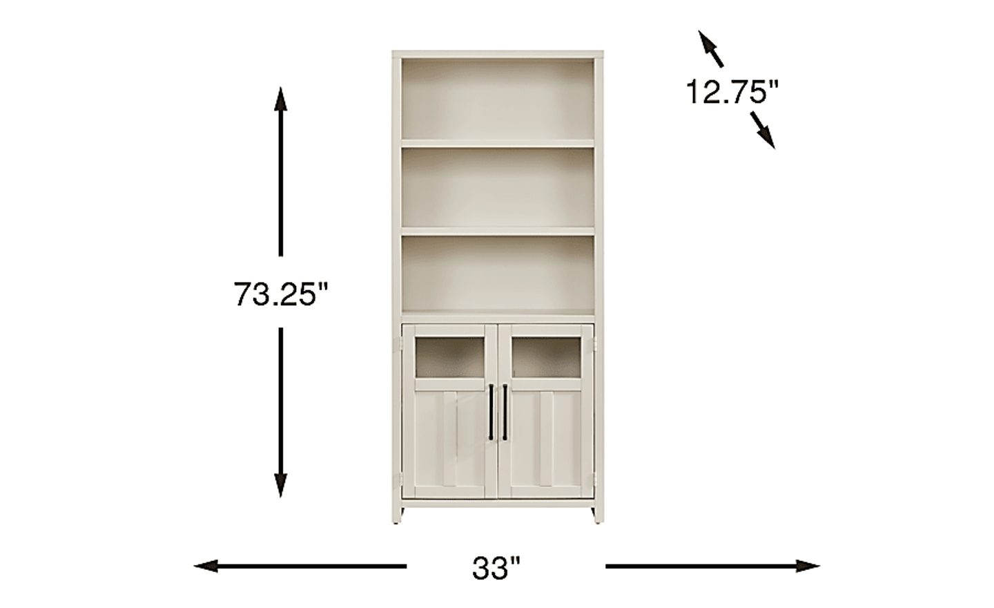 Unwind in a world of understated symmetry, warmth and charm with the Amberfield collection's balance of farmhouse elegance and modern functionality. Crafted from rich maple veneers in a beautiful white finish, this rustic pier has plenty of display and storage space with three open shelves and a bottom cabinet. Both doors are adorned with black metal pulls and a top glass window to enhance the look.