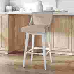 This stool is upholstered in a performance-oriented oatmeal fabric specifically engineered to be kid-friendly and pet-friendly. The material is stain-resistant and easy to clean, ensuring that the neutral beige tone remains fresh even in high-traffic dining areas.