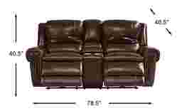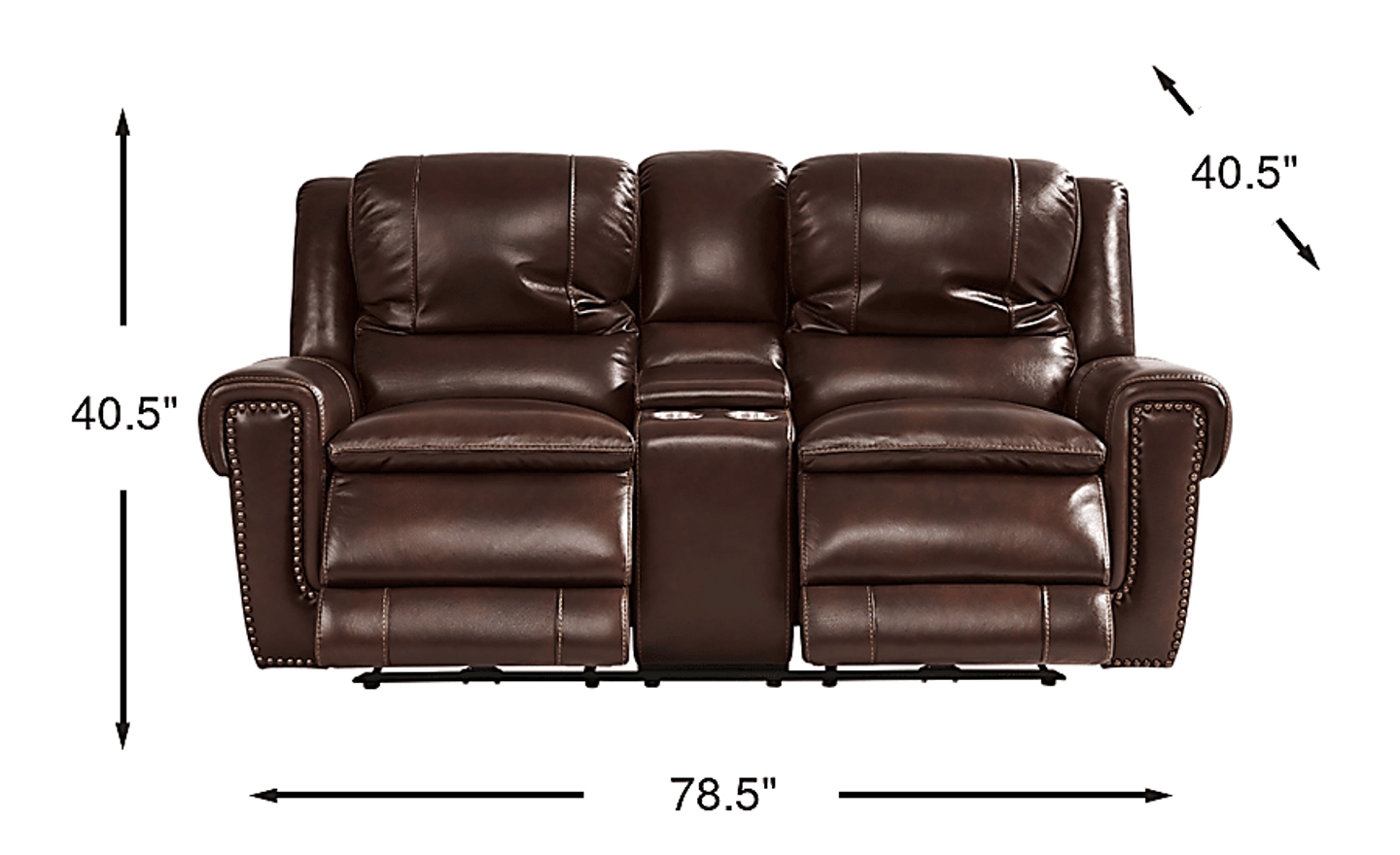 Impress your guests with the Amesbury loveseat. Perfect for two, this piece features dual power reclining at the touch of a button. Padded armrests, footrests and seat cushions ensure comfy support while square arms add an on-trend look. Brown top grain leather where the body touches add refined appeal as the subdued color invites calm warmth to the room. Conveniently hidden, the console storage conceals electronics, magazines and more, while twin cupholders carefully hold beverages. Channeled backs, contrast stitching and burnish brass nail head trim complete the transitional look. Upholstery: Top grain leather where the body touches. Polyurethane sides and backs.