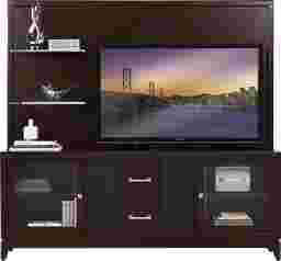 Store your flat screen TV and electronics in style with the Amesbury wall unit. The transitional style and dark cherry finish easily complements many types of décor. Beveled glass doors framed in wood open to storage shelves while upholstered drawer fronts with a rich leather look lend a refined quality. The wall unit's back panel features pass through holes for wire management and twin glass shelves enhanced with LED lights. Satin nickel finished hardware adds the finishing touch. Quality made with birch solids and veneers this piece offers a stylish storage solution.