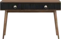 The Amilalane black and walnut wood console table is the reliable and rich console table you and your home have been searching for. This rich table features 2 drawers with a soft-closing gliding function, giving you ample space to organize your home. This table will make a simple storage solution to any well appointed space in your home. The wonderful accents of this table add so much to this piece, especially the striking drawer pulls that stand out against the dark wood. Customer assembly is required.